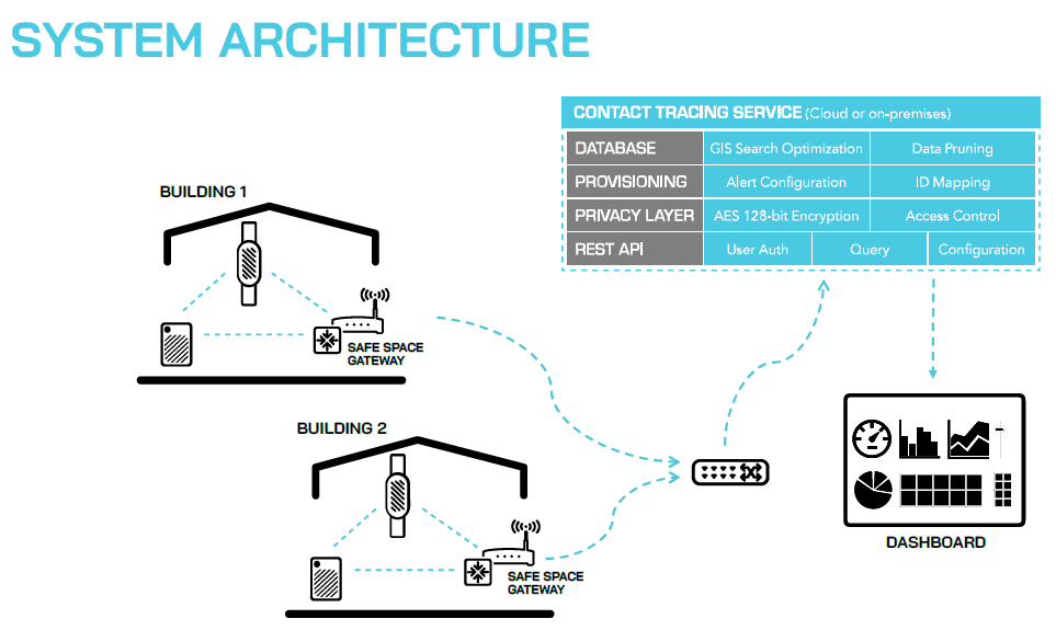 The Safe Space wearable nodes enable precise device-to-device passive distance monitoring accurate down to the millimetre. When Safe Space devices become closer than a configurable minimum distance, such as 6ft or 2 metres, the devices alert the users through vibration, by flashing a warning light, and by sounding an audible alarm, at which point the interaction is captured by our system. In the event of a potential COVID-19 case, the encrypted interaction data gives companies a detailed view of impacted employees and areas, allowing for targeted contact tracing and area closures rather than full scale shutdowns.