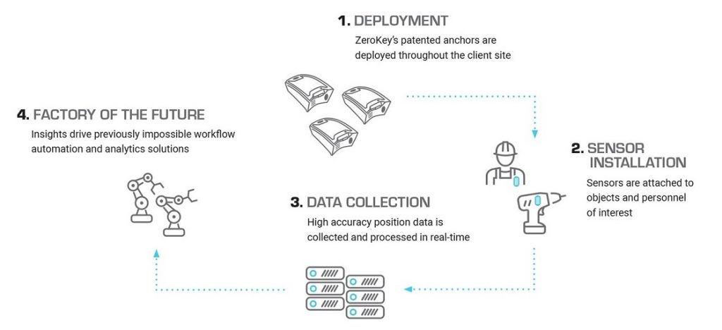 ZeroKey’s product Smart Space is best described as a wide-area acoustics-based indoor positioning system. Kind of like GPS, but it works indoors where GPS signals can’t reach. What it does is provide building-wide millimetre-level 3D tracking of objects using a coin-sized IIoT sensor that communicates with other sensors and nodes placed throughout a space. It sounds complicated, but at its core Smart Space is a real-time tracking system, and the position data it generates is used in a variety of applications such as workflow automation, inventory tracking, and health and safety.